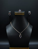 This elegant jewelry set features a fluid, swirling design crafted in a warm rose gold-toned metal. The set includes a necklace, a pair of earrings, and a ring, each showcasing a captivating sapphire blue stone accented by delicate metalwork. The necklace pendant boasts an open, swirling design that cradles a vibrant sapphire blue gemstone. The coordinating stud earrings echo this graceful form with their own petite swirls and blue stones. Completing the set is a ring with a complementary swirling motif and a central sapphire blue gem. This set adds a touch of artistic flair and sophisticated color to any ensemble, perfect for both everyday elegance and special occasions.