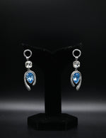 Design: A single round clear stone connects to a unique, hourglass-shaped silver-tone metal piece, which holds a large light blue teardrop stone.