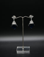 These striking drop earrings feature a bold, geometric design with a distinct Art Deco influence. The top of the earring is a pointed, fan-like stud, meticulously encrusted with sparkling pavé-set clear stones. Below this, a tiered, triangular section, also covered in pavé stones, adds depth and movement. The centerpiece is a large, faceted, cushion-cut stone in a deep, sapphire blue, which hangs elegantly at the bottom. The rich color of the main stone contrasts beautifully with the brilliant clear accents and silver-toned setting. These earrings are a perfect choice for those who appreciate vintage-inspired glamour and a touch of dramatic elegance.