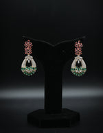 These elegant and colorful drop earrings feature a striking floral-inspired design. The top section, which attaches to the ear, is a leaf or floral branch motif set with rich, ruby-red stones. From this point, a delicate, inverted teardrop or wreath-like shape dangles. This lower section is brilliantly set with sparkling white stones on the top and side edges, while the bottom section is filled with vibrant, emerald-green stones. The juxtaposition of the three colors—ruby, emerald, and clear—creates a beautiful and festive look. These earrings are a perfect accessory for holiday parties, formal dinners, or any event where you want to add a touch of vibrant sophistication.