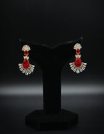 These glamorous drop earrings feature a bold and striking design with a clear Art Deco influence. The top of the earring is a small, fan-shaped stud adorned with sparkling clear stones, set in a gold-toned metal. Below this, a series of three vibrant, ruby-red stones—two marquise-cut and one teardrop-cut—create a central cascade of color. The final and most dramatic section is a large, sweeping fan of brilliant white baguette and round-cut stones, which creates a powerful and elegant finish. The combination of the deep red and brilliant clear stones in a geometric, fan-like shape gives these earrings a timeless, vintage-inspired luxury, perfect for making a statement at a formal event or a special celebration.