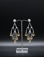 These dazzling chandelier earrings are a beautiful blend of geometric design and sparkling color. The structure begins with a polished, silver-tone stud or ball, from which an intricate, tiered, diamond-shaped frame descends. This frame is crafted from thin, polished silver-tone metal wires, creating an elegant, openwork design. Suspended within and at the bottom of the frame are multiple faceted, brilliant stones in a warm, amber or citrine hue. The stones are cut in a teardrop or pear shape, and their radiant color provides a stunning contrast against the silver. The earrings have a beautiful movement and sparkle, making them a perfect statement piece for formal events, evening wear, or for adding a touch of sophisticated glamour and fiery color to any outfit.