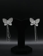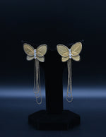 These unique and whimsical earrings feature a beautiful butterfly design with an elegant drop. The body of the butterfly is a textured, possibly gold-toned, mesh or filigree, giving it a delicate, lace-like appearance. The wings are adorned with a few small, sparkling cubic zirconia stones, adding a touch of brilliance. From the bottom of the butterfly, a series of delicate, fine chains hang, creating a graceful tassel effect that sways with movement. These earrings are a perfect blend of natural inspiration and refined style, making them a charming and sophisticated accessory for a garden party, a semi-formal event, or for adding a touch of unique flair to an everyday look.