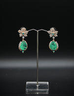 These exquisite earrings combine natural beauty with refined craftsmanship. The top of the earring is a beautifully detailed floral stud, crafted in a warm, gold-toned metal. The petals are adorned with sparkling clear cubic zirconia stones, and a single accent stone sits at the center, adding a touch of brilliance. Dangled from this floral top is a stunning, raw or semi-raw emerald stone in a teardrop shape. The natural texture and rich green color of the emerald are a striking contrast to the polished, glittering floral stud, creating a piece that is both earthy and elegant. These earrings are perfect for a special event or for adding a touch of unique sophistication to any outfit.