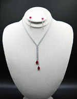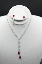 Design Theme: Elegant Y-necklace and drop earring set with cascading clear crystals and deep red teardrop gemstones.