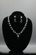 The Verdant Twilight Jewelry Set is a breathtaking and sophisticated ensemble that harmoniously blends the deep blues of a twilight sky with the lush greens of a vibrant landscape. This stunning set includes a collar necklace and a pair of matching drop earrings, each piece meticulously crafted to showcase a captivating and symmetrical arrangement of vibrant square-cut emerald-green and deep blue gemstones, punctuated by brilliant clear crystals.