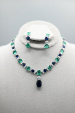Main Gemstones: Square-cut emerald-green and deep blue gemstones. The necklace pendant features a single large, deep blue cushion-cut gemstone.