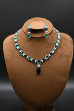 The accompanying earrings perfectly mirror the necklace's design, each featuring a symmetrical drop of a square-cut emerald-green gemstone, followed by a cluster of clear crystals, and finally a square-cut deep blue gemstone. This arrangement provides a cohesive and balanced look that beautifully complements the necklace. The secure backings ensure the earrings hang elegantly and comfortably, catching the light with every movement.