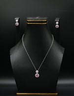This beautiful jewelry set features a sterling silver necklace with a stacked pendant design. The pendant is composed of two circular elements: a smaller one on top and a larger one below. Each element features a brilliant, round-cut pink garnet gemstone at its center, surrounded by a sparkling halo of small cubic zirconia stones. The design is elegant and eye-catching. The set includes a pair of coordinating stud earrings that echo the pendant's design, with a single pink garnet stone and a halo of cubic zirconia. The vibrant pink of the garnets and the brilliance of the zirconia create a luxurious and classic look.