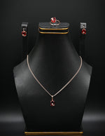 This sophisticated jewelry set features a timeless and minimalist design, crafted in a warm rose gold-toned metal and featuring a deep red, faceted gemstone. The set includes a delicate pendant necklace, a matching ring, and a pair of stud earrings. Each piece showcases a single, prominent square-cut gemstone, likely a ruby or garnet, expertly set to maximize its brilliance. The rich, ruby-red hue provides a dramatic contrast to the soft blush of the rose gold, creating a classic and elegant look that is perfect for any occasion.