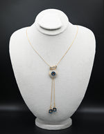 This is a sophisticated and modern lariat-style necklace featuring a unique, circular pendant. The centerpiece is a striking round gemstone, possibly a dark blue or iridescent crystal, which is surrounded by a halo of smaller, sparkling clear stones. The necklace has a sleek, gold-toned chain that passes through a decorative element above the main pendant. This creates a lariat effect, with two delicate chains dangling below. These chains are tipped with small, faceted beads that echo the deep color of the central gemstone, giving the piece a graceful and elegant silhouette. The design is both classic and contemporary, making it a versatile statement piece.