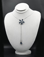 This is an elegant and modern lariat-style necklace that features a delicate floral or snowflake-like pendant. The centerpiece is a cluster of gemstones, with marquise-cut dark blue stones forming the petals around a clear, sparkling center. The necklace is a sleek, silver-toned chain that splits below the central pendant, with two separate chains dangling down. Each of these chains is tipped with a teardrop-shaped dark blue stone, giving the piece a graceful and elongated silhouette. The design is both sophisticated and contemporary, making it a versatile accessory for various necklines and occasions.