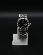 A timeless and elegant wristwatch crafted in premium stainless steel with a bold black dial and diamond-style hour markers. The fluted bezel and polished bracelet add a touch of sophistication, while the date display at 3 o’clock with magnified lens ensures practicality. Designed for those who appreciate both style and functionality, this watch is perfect for business wear, formal occasions, or daily luxury.