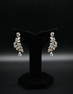 These exquisite drop earrings feature a delicate and intricate floral and vine-inspired design. The earrings are crafted with a warm, rose gold-toned setting that beautifully complements the brilliant sparkle of the stones. A cluster of various-sized cubic zirconia stones, cut to resemble petals and leaves, branch elegantly downward from a single stud. The design culminates in a single, larger teardrop-shaped stone that dangles at the bottom, adding a touch of graceful movement. These earrings are a perfect blend of natural beauty and modern glamour, ideal for weddings, anniversaries, or any formal event.