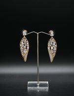 These graceful drop earrings are designed in a delicate, elongated leaf shape. The earrings feature a warm, rose gold-toned setting that beautifully highlights the brilliant stones. The interior of the leaf is filled with a sparkling arrangement of clear cubic zirconia stones in various shapes and sizes, giving it a rich, textured look. The edges of the leaf are outlined with a fine pavé of smaller stones, adding a touch of defined shimmer. These earrings combine a natural, organic form with luxurious sparkle, making them a sophisticated and eye-catching accessory for a wedding, garden party, or any elegant occasion.