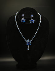 This is a stunning and elegant jewelry set featuring a necklace and a pair of matching drop earrings. The design is characterized by its brilliant sapphire-blue gemstones. The necklace has a delicate, single-strand chain composed of small, shimmering blue stones. At the center, a beautiful floral or snowflake-like cluster of stones serves as the main pendant, from which a single teardrop-shaped stone gracefully dangles. The matching earrings mirror this design, with a similar cluster of stones from which a drop-shaped stone hangs. The silver-toned metal setting enhances the vibrant blue color of the gems, creating a luxurious and captivating look.