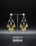 These dazzling chandelier earrings are a beautiful blend of geometric design and sparkling color. The structure begins with a simple, silver-tone stud or ball, from which an intricate, tiered, diamond-shaped frame descends. This frame is crafted from thin, polished silver-tone metal wires, creating an elegant, openwork design. Suspended within and at the bottom of the frame are multiple faceted, brilliant stones in a warm, amber-to-citrine hue. The stones are cut in a teardrop or pear shape, and their radiant color provides a stunning contrast against the silver. The earrings have a beautiful movement and sparkle, making them a perfect statement piece for formal events, evening wear, or for adding a touch of sophisticated glamour and fiery color to any outfit.