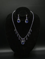 This is an elegant and classic jewelry set featuring a necklace and matching drop earrings. The design is characterized by its deep, royal blue gemstones, which are primarily in a teardrop shape. The necklace has a delicate, silver-toned chain from which a series of smaller teardrop stones cascade, leading down to a beautiful, larger teardrop-shaped centerpiece surrounded by a cluster of smaller gems. The earrings perfectly match this design, with a small stud and a larger teardrop-shaped stone dangling below. The dark gems against the silver metal create a look of timeless sophistication.